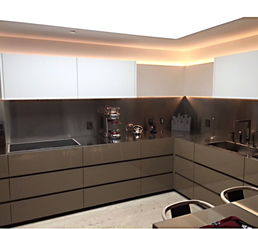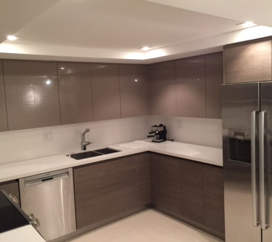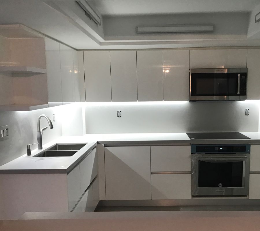 Kitchen made for the beach of Dania, with auxiliary island in white quartz, lower doors in brown, top in Orange Glass.